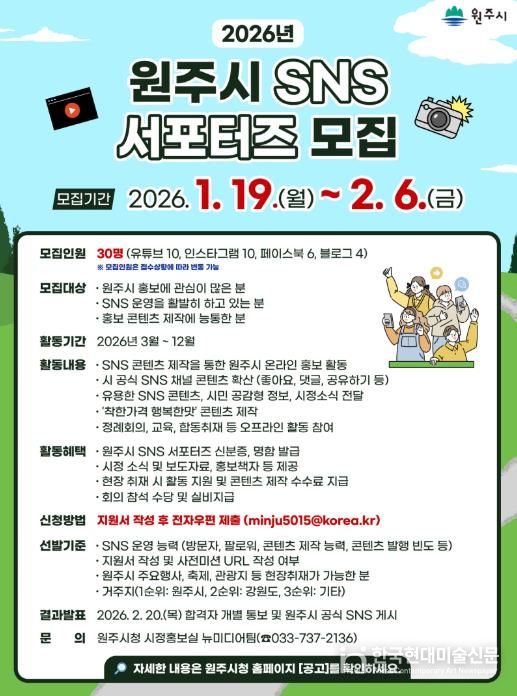 한국현대미술신문 원진 기자 | 원주시는 참신한 아이디어와 열정을 가진 ‘2026년 원주시 SNS 서포터즈’를 다음 달 6일까지 모집한다.