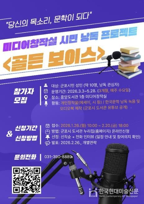 한국현대미술신문 배윤섭 기자 | 군포시 중앙도서관은 시민이 직접 참여하는 낭독 콘텐츠 제작을 통해 공공 문화콘텐츠를 확산하고, 시민의 창작 경험을 지원하기 위해 미디어창작실 시민 낭독 프로젝트 '골든 보이스'를 운영한다.