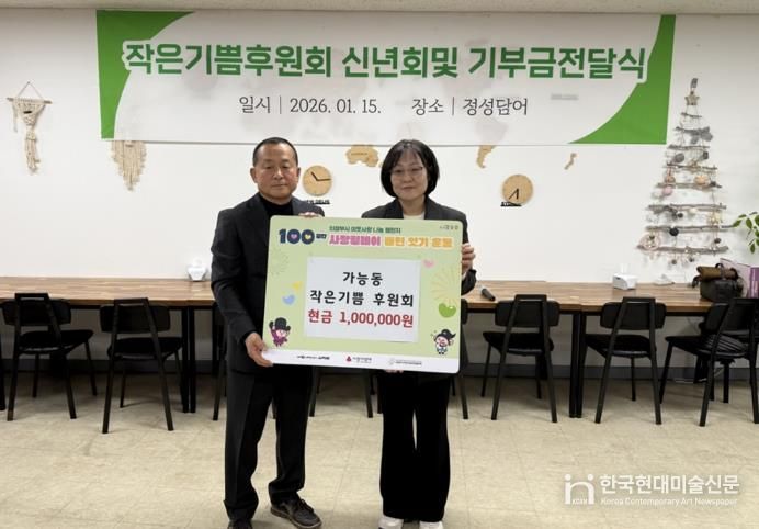 한국현대미술신문 배윤섭 기자 | 의정부시 가능동주민센터는 1월 15일 작은기쁨후원회가 ‘100일간 사랑릴레이 배턴 잇기’에 동참하며 성금 100만 원을 기탁했다고 밝혔다.