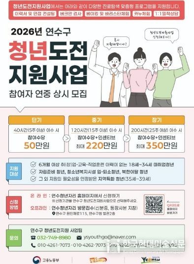 한국현대미술신문 박재남 기자 | 연수구는 청년들의 경제 활동과 노동시장 진입을 돕기 위해 ‘2026년 청년도전지원사업’ 참여자를 모집한다.