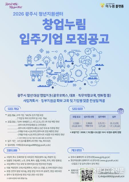 한국현대미술신문 배윤섭 기자 | 광주시는 지역 내 유망한 청년 창업가를 발굴하고 안정적인 창업 환경을 조성하기 위해 ‘2026년도 창업누림 신규 입주기업’을 공개 모집한다고 19일 밝혔다.