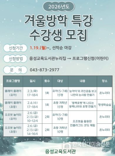 한국현대미술신문 신정은 기자 | 음성교육도서관(관장 백경미)은 겨울방학을 맞아 유아와 초등학생 저학년을 대상으로 다양한 창의적 체험과 학습 활동을 제공하는 겨울방학 특강을 운영한다고 밝혔다.