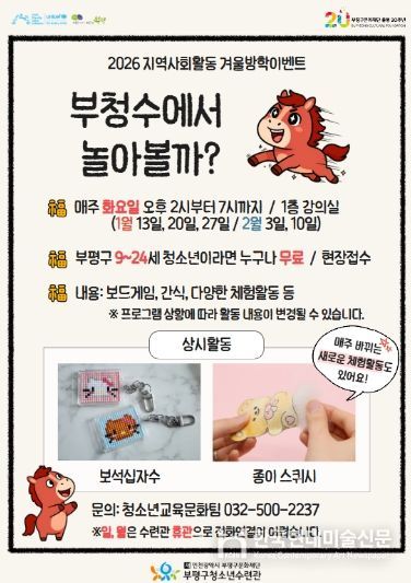 한국현대미술신문 박재남 기자 | 부평구 청소년수련관은 오는 20일부터 다음달 10일까지 겨울방학을 맞아 지역 청소년을 위한 2026 지역사회활동 겨울방학 이벤트 ‘부청수에서 놀아볼까’를 진행한다.
