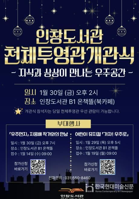 한국현대미술신문 배윤섭 기자 | 구리시는 오는 1월 30일 오후 2시 인창도서관 지하 북카페에서 주요 내빈이 참석한 가운데 4층 야외에 조성된 인창도서관 천체투영관 개관식을 개최한다고 밝혔다.