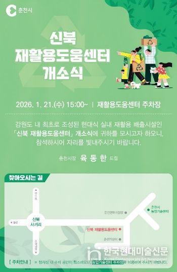 춘천시는 오는 21일 오후 3시 신북읍 산천리 신북 재활용도움센터에서 개소식을 열고 시민 중심의 자원순환 체계 구축에 나선다. 이날 개소식에는 육동한 춘천시장과 김진호 춘천시의회 의장 등 주요 내빈이 참석해 지속 가능한 자원순환 정책에 대한 의지를 공유한다.
