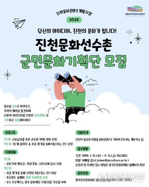 한국현대미술신문 신정은 기자 | 생거진천문화재단은 지역의 일상과 이야기를 문화콘텐츠로 만들어가는 문화 기획 프로젝트 ‘문화선수촌’에 참여할 군민문화기획단을 모집한다고 20일 밝혔다.