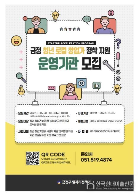 한국현대미술신문 정소영 기자 | 부산 금정구는 지역에 정착할 수 있는 청년 로컬 창업가를 육성하기 위해 ‘금정 청년 로컬 창업가 정착 지원’ 사업을 추진하고, 이를 운영할 운영기관(보조사업자)을 공개 모집한다고 밝혔다.