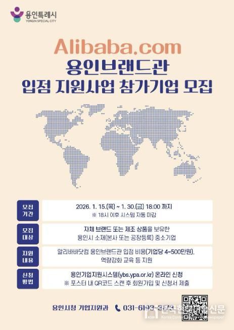 한국현대미술신문 배윤섭 기자 | 용인특례시는 오는 1월 30일까지 B2B(기업 간 거래) 플랫폼 알리바바닷컴 내 ‘용인브랜드관’(YoGo) 입점 참가기업을 모집한다고 20일 밝혔다.