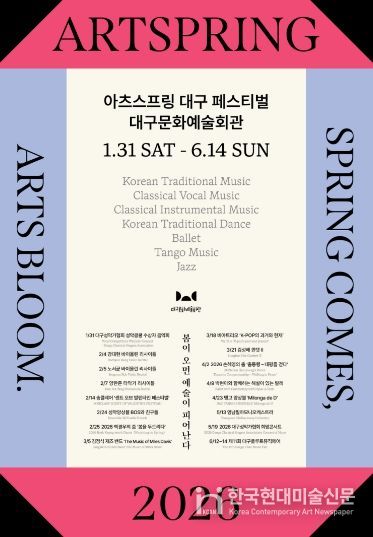 한국현대미술신문 정소영 기자 | 대구문화예술회관은 대구를 기반으로 활동하는 지역 예술인들의 공연을 한데 모아 그들의 예술혼을 집중 조명하는 축제 '2026 아츠스프링 대구 페스티벌'의 16개 공연을 오는 1월 31일부터 6월 14일까지 대구문화예술회관에서 개최한다고 밝혔다.