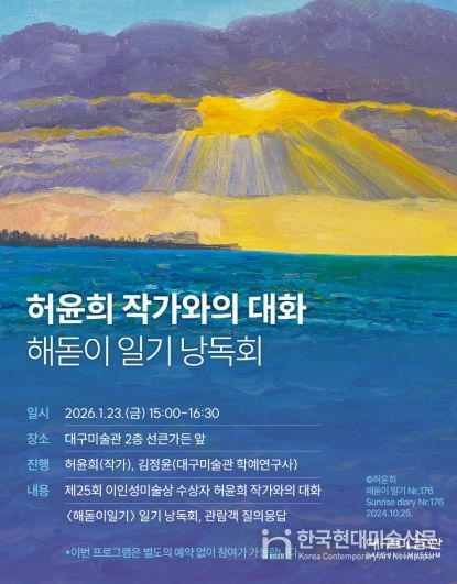 한국현대미술신문 정소영 기자 | 대구문화예술진흥원 대구미술관은 제25회 이인성미술상 수상자전 ‘허윤희: 가득찬 빔’의 전시 연계 프로그램으로 ‘허윤희 작가와의 대화: 해돋이 일기 낭독회’를 1월 23일 오후 3시, 대구미술관 2층 선큰가든에서 개최한다.