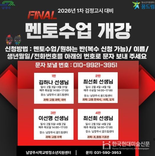 한국현대미술신문 배윤섭 기자 | 남양주시는 오는 2월 3일부터 남양주시학교밖청소년지원센터에서 학업을 중단한 청소년을 대상으로 ‘2026년도 제1회 검정고시 대비 학습 멘토링 프로그램’을 운영한다고 밝혔다.