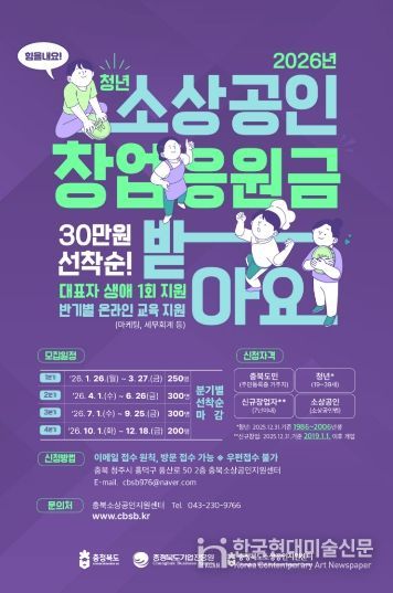 한국현대미술신문 신정은 기자 | 충북도와 (재)충청북도기업진흥원(소상공인지원센터)이 ‘2026년 청년 소상공인 창업응원금 지원사업’의 1분기 참여자 250명을 1월 26일부터 오는 3월 27일까지 선착순으로 모집한다.