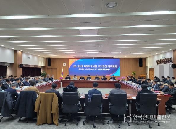 도는 23일 도청 대회의실에서 신일호 안전기획관 주재로, 도 관련 부서 및 시군 과장들이 참석한 가운데 ‘재해복구사업 조기 추진 대책회의’를 개최했다.