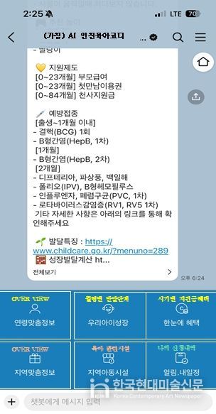 이에 인천시는 카카오톡 기반 챗봇을 활용해 행정 절차와 예산 부담을 줄이는 동시에 연령과 거주 지역에 따른 맞춤형 육아 정보를 한눈에 확인할 수 있도록 제공할 계획이다.