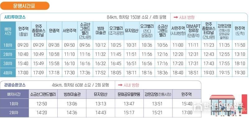 한국현대미술신문 원진 기자 | 원주시는 다음 달 3일부터 기존 노선을 개편해 새로운 순환형 시티투어버스 노선을 운행한다.
