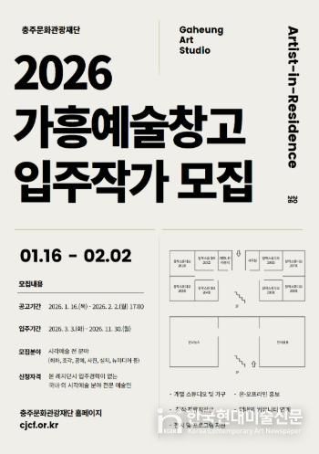 한국현대미술신문 신정은 기자 | (재)충주문화관광재단이 충주공예전시관 레지던시‘가흥예술창고’4기 입주작가를 오는 2월 2일까지 공개 모집한다고 밝혔다.