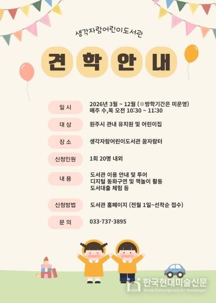 한국현대미술신문 원진 기자 | 원주시 생각자람어린이도서관은 오는 3월부터 12월까지 관내 유치원과 어린이집 원아를 대상으로 견학 프로그램을 운영한다.