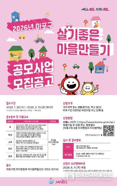 한국현대미술신문 배건 기자 | 마포구는 주민이 제안한 아이디어를 지원해 마을공동체 활성화를 도모하는 ‘2026년 마포구 살기좋은 마을만들기 공모사업’ 참여 대상자를 2월 13일까지 모집한다.