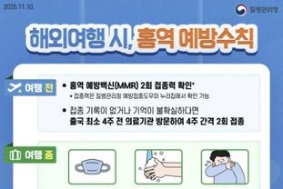 홍역은 예방접종을 통해 충분히 예방이 가능한 감염병으로, 생후 12~15개월과 만 4~6세에 총 2회(MMR) 예방접종을 완료하는 것이 가장 효과적인 예방법이다. 특히 해외여행 계획이 있거나 다중이용시설 이용이 잦은 경우, 예방접종 이력을 반드시 확인할 필요가 있다.