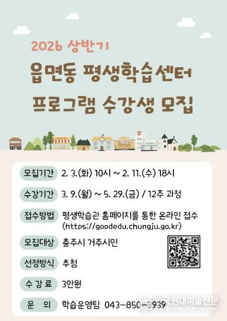 한국현대미술신문 신정은 기자 | 충주시 평생학습관은 시민 누구나 거주지 인근에서 배움의 기회를 누릴 수 있도록 2026년 상반기 읍면동 평생학습센터 프로그램 수강생을 모집한다고 30일 밝혔다.