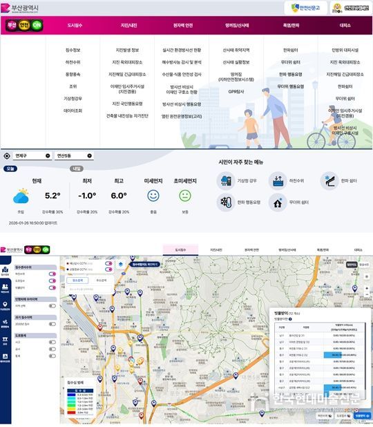 '부산 안전 ON'은 그동안 여러 기관과 시스템에 분산되어 있던 각종 재난·안전 정보를 통합해 시민들에게 제공하는 도시 안전 종합 서비스로 ▲도시침수 ▲지진/내진 ▲원자력안전 ▲땅꺼짐/산사태 ▲폭염/한파 ▲대피소 등 6개 분야로 구성돼 있으며, 분야별 핵심 정보를 한눈에 확인할 수 있도록 설계됐다.