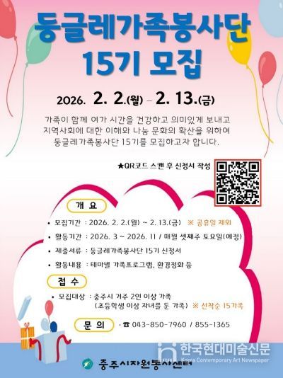한국현대미술신문 신정은 기자 | 충주시자원봉사센터(센터장 심영자)는 관내에 거주하는 초등학생 이상 자녀를 둔 2인 이상 가족을 대상으로 15기 둥글레가족봉사단으로 활동할 15가족을 선착순 모집한다.