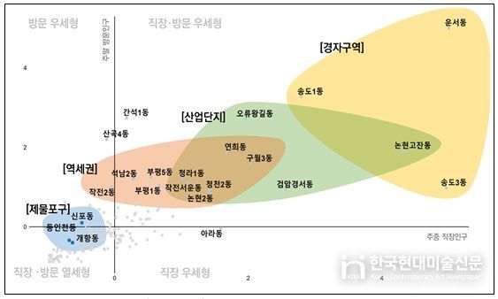 개항장이나 부평, 구월 일대는 직장인구보다 방문인구가 큰 특성을 보이는 반면, IFEZ(송도·청라)의 경우 방문인구보다 직장인구가 큰 특징을 보인다는 점이 다르다.
