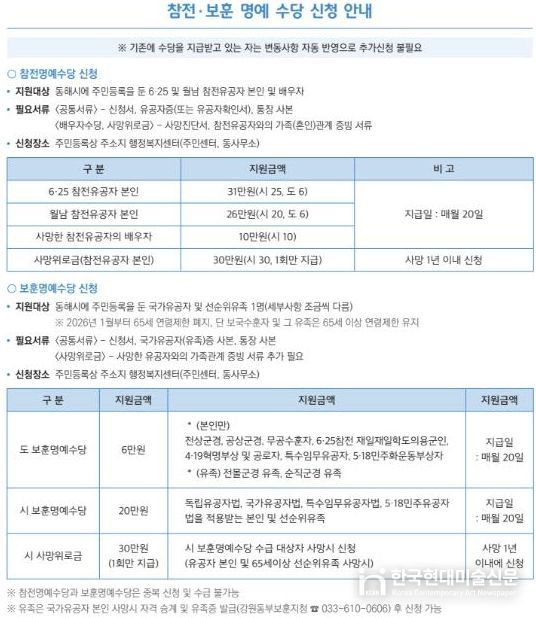 한국현대미술신문 원진 기자 | 동해시는 나라를 위해 헌신한 국가유공자와 그 유가족들의 명예를 드높이고 안정적인 생활을 지원하기 위해 보훈 복지체계를 강화한다고 밝혔다.