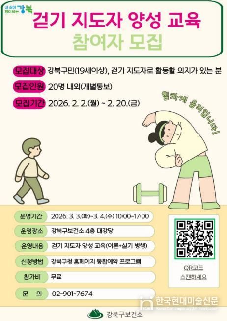 한국현대미술신문 배건 기자 | 서울 강북구가 주민 주도의 걷기 문화 확산과 신체활동 실천율 향상을 위해 ‘걷기 지도자 양성 교육’ 참여자를 모집한다.