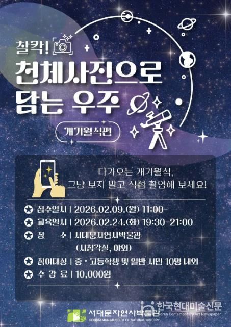 한국현대미술신문 배건 기자 | 서대문구가 서대문자연사박물관에서 체험형 강좌인 ‘찰칵! 천체사진으로 담는 우주 – 개기월식 편’을 마련했다고 3일 밝혔다.