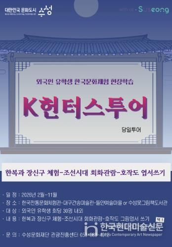 한국현대미술신문 정소영 기자 | 대구 수성문화재단은 올해 2월부터 11월까지 대구·경북 외국인 유학생을 대상으로 한국문화체험 현장학습 ‘K헌터스 투어’를 운영한다.