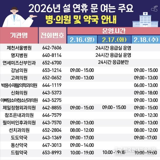 아울러 응급의료기관과 연휴 기간 문 여는 병의원 및 약국을 지정 운영하고 비상진료체계를 유지해 의료 공백을 최소화할 계획이다. 연휴 기간 문 여는 의료기관과 약국 정보는 제천시 보건소(646-2720) 및 시 홈페이지를 통해 적극 홍보할 예정이며 보건복지콜센터, 응급의료포털을 통해서도 확인할 수 있다.