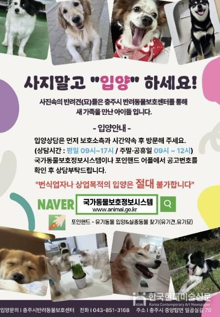 한국현대미술신문 신정은 기자 | 충주시는 반려동물보호센터에서 보호 중인 유실·유기동물의 장기체류와 안락사를 예방하고 입양을 활성화하기 위해 ‘입양비 지원사업’을 실시한다고 4일 밝혔다.