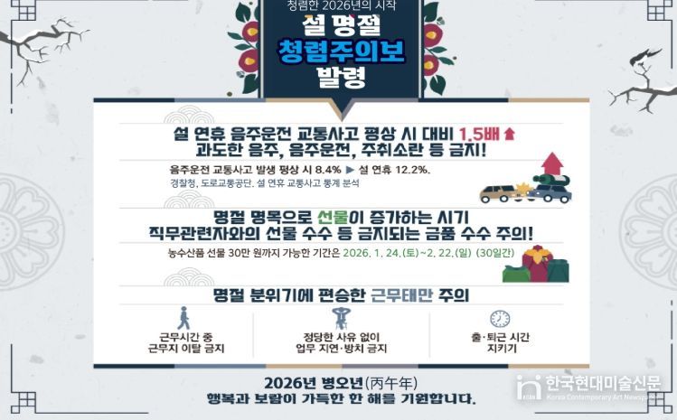 ‘청렴주의보’는 명절과 연말연시 등 부패 위험이 높아지는 시기에 발생할 수 있는 청렴 저해 요인을 사전에 안내하고, 행동강령 위반을 예방하기 위한 공직사회 자정 활동의 하나다.