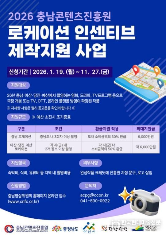 한국현대미술신문 신정은 기자 | 충남콘텐츠진흥원이 추진하는 ‘충남·당진·아산·예산 로케이션 인센티브 지원사업’이 영상산업계의 주목을 받고 있다.