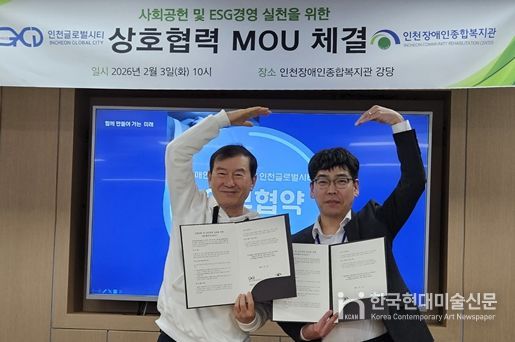 한국현대미술신문 박재남 기자 | 인천시사회서비스원 소속 인천시장애인종합복지관은 최근 ㈜인천글로벌시티와 손잡고 지역사회 장애인 복지 증진에 나선다고 4일 밝혔다.