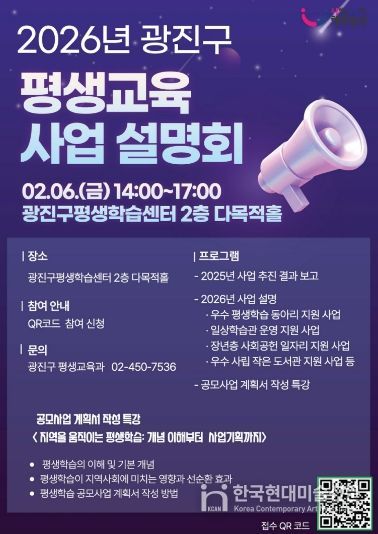한국현대미술신문 배건 기자 | 광진구가 오는 2월 6일 오후 2시 광진구 평생학습센터(자양로15길 60)에서 ‘2026년 광진구 평생교육사업 설명회’를 개최한다.