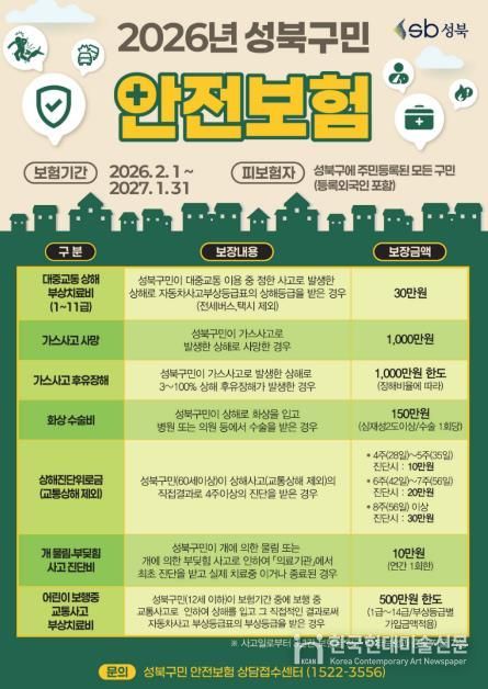 한국현대미술신문 배건 기자 | 서울 성북구가 재난과 각종 사고로 피해를 입은 구민의 생활 안정을 지원하기 위해 ‘2026년 성북구민 안전보험’을 2월 1일부터 시행했다.