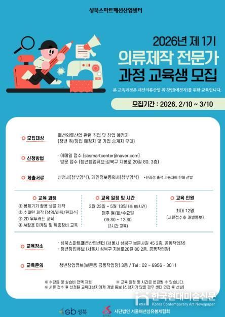 한국현대미술신문 배건 기자 | 서울 성북구가 (사)서울패션섬유봉제협회에 위탁 운영 중인 성북스마트패션산업센터에서 2026년 제1기 의류제작 전문가과정 교육생을 모집한다.