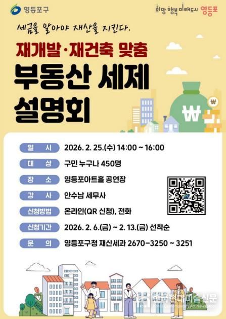 한국현대미술신문 배건 기자 | 영등포구가 영등포 전역에서 87개 재개발 재건축 등 정비사업이 추진되면서 높아진 부동산 세제에 대한 관심에 부응하고자, 오는 25일 영등포 아트홀에서 ‘재개발 재건축 맞춤 부동산 세제 설명회’를 개최한다고 밝혔다.