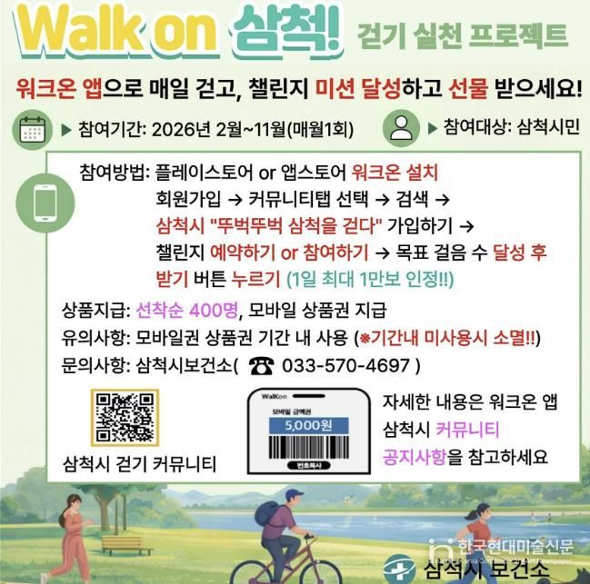 한국현대미술신문 원진 기자 | 삼척시는 시민들의 건강 증진과 일상 속 걷기 실천율 향상을 위해 모바일 걷기 앱 '워크온(Walk On)'을 활용한 ‘워크온 걷기 챌린지’를 오는 2월부터 11월까지 운영한다.