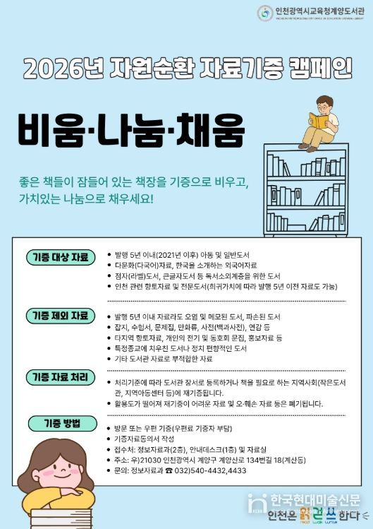 한국현대미술신문 박재남 기자 | 인천광역시교육청계양도서관은 시민과 지역사회가 함께하는 자원순환형 독서문화 확산을 위해 2026년 자료기증 캠페인 ‘비움·나눔·채움’을 연중 운영한다고 5일 밝혔다.