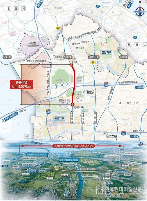 중봉터널 건설사업은 남북 2축 중 단절된 중봉대로(서구 경서동과 왕길동 구간)를 연결하는 총연장 4.57km, 왕복 4차로 규모의 민간투자사업으로 국비 512억 원이 투입되며 봉수대로와 서곶로 일대의 교통혼잡을 완화할 것으로 기대된다.