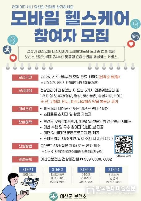 한국현대미술신문 신정은 기자 | 예산군 보건소는 오는 9일부터 ‘2026년 모바일 헬스케어 사업’ 참여자 80명을 선착순 모집한다.