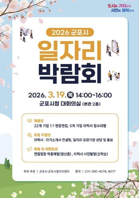 한국현대미술신문 배윤섭 기자 | 군포시는 오는 3월 19일 오후 2시부터 시청 대회의실에서 ‘2026년 군포시 일자리 박람회’를 개최함에 따라 2월 10일부터 2월 27일까지 박람회에 참여할 기업체를 모집한다.
