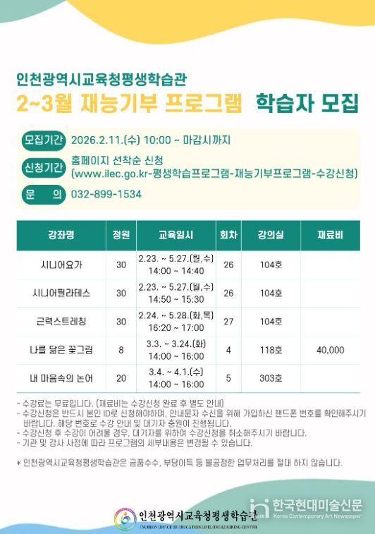 한국현대미술신문 박재남 기자 | 인천광역시교육청평생학습관은 오는 23일부터 ‘재능기부 프로그램’을 운영한다.