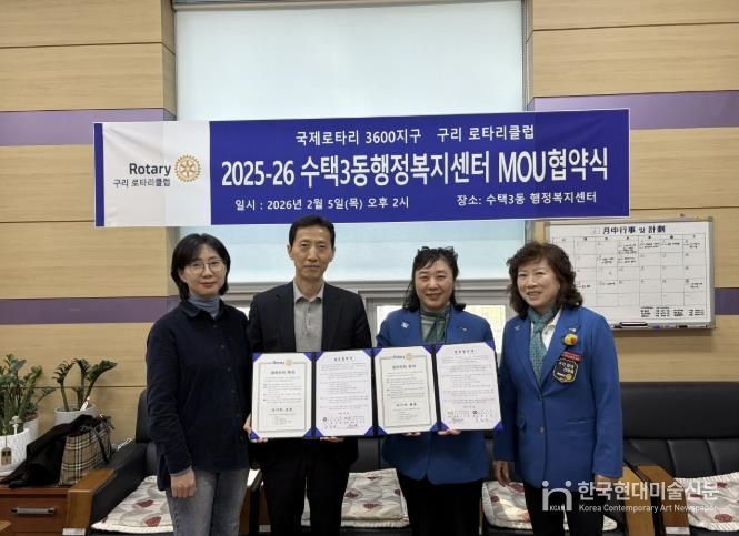 한국현대미술신문 배윤섭 기자 | 구리시 수택3동 행정복지센터는 지난 5일, 구리로타리클럽과 지역사회 취약계층의 복지 증진과 나눔 문화 확산을 위한 업무 협약을 체결했다고 밝혔다.