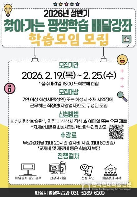 한국현대미술신문 배윤섭 기자 | 화성특례시는 2월 19일부터 2월 25일까지 2026년 상반기'찾아가는 평생학습 배달강좌'학습모임을 모집한다.