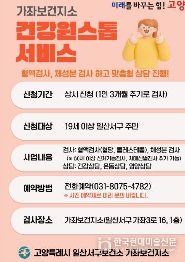 한국현대미술신문 배윤섭 기자 | 고양특례시 일산서구보건소 가좌보건지소는 지역 주민들의 만성질환을 조기에 발견하고 체계적인 건강관리를 지원하기 위해 건강원스톱 서비스를 연중 운영한다고 밝혔다.