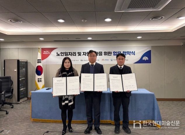 한국현대미술신문 신정은 기자 | 충남도는 6일 도청 소회의실에서 김영명 도 환경산림국장과 오성환 홍성군 문화복지국장, 이정희 홍성시니어클럽 과장이 ‘노인일자리 및 자원순환을 위한 업무협약’을 체결했다고 밝혔다.
